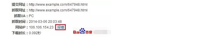 抓取診斷工具會檢查站點與百度的連接是否暢通,若站長發現IP信息還是老舊的,可以通過“報錯”通知百度搜索引擎更新IP,如下圖所示: